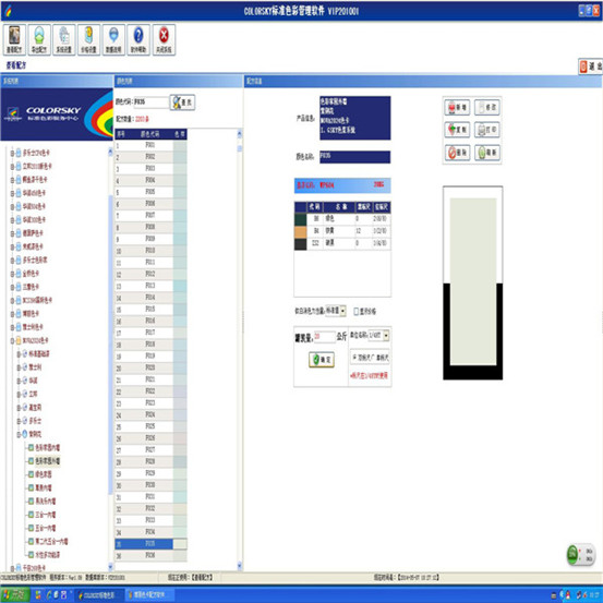 配色軟件配方(fāng)準(zhǔn)確,實用性強。使用(yòng)方便,客戶隻要輸入顏(yán)色編(biān)號,查處該顏色的標準配方,知道調色的色漿種(zhǒng)類和添加數量,極大的方便調色。另外,軟件自身的成本管理(lǐ)功能,也非常使用,客戶可以(yǐ)極其(qí)方便的產出每種顏色的調色成本,有針對性的報價,或者核算(suàn)成本。